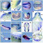 foxd1 () gene expression in Xenopus laevis embryo via in situ hybridization, NF stage 13 (top), anterodorsal view, dorsal up, and NF stage 20/21 (bottom) lateral view, anteriorleft, dorsal up.