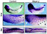 Fig. 6. In situ hybridization of Xmsr and Xfer. Xmsr and Xfer whole-mount in situ hybridization of XHyal2-injected and control embryos. Xmsr expression was used as a marker for PVEC of the primordial vitelline veins. Very little PVEC were detected in the posterior-ventral part of Xhyal2-injected embryos (D,E) when compared to control embryos (A,B). Dashed lines show the boundary on the flanking position of the PVEC pattern. In (B,E) close-up views are presented. Arrowheads indicate the posterior-ventral border of migrating PVEC as indicated by a dashed line in (A,D). Hyperfusion of merging PVEC in Xhyal2-injected embryos is indicated by a white arrow (E). The expression of Xfer, a marker for red blood cells, appeared largely equivalent in XHyal2-injected embryos and controls with subtle individual differences that were also observed in uninjected siblings (C,F).