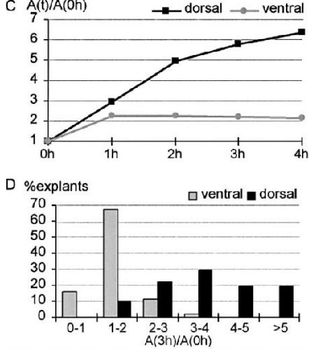 size [A (0h)]. (D) Spreading behaviour of dorsal and ventral groups of cells. For each region the sizes of 45 explants (five pooled experiments)