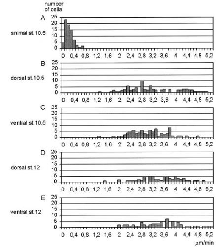 measured to calculate the average velocity in mm/min. At least 60 cells/region were traced in three experiments. (A-C) stage 10.5: (A) animal cells do not migrate. (B) dorsal mesendodermal cells and (C) ventral mesendodermal cells are highly migratory. (D and E) stage 12: (D) dorsal mesendodermal cells and (E) ventral mesendodermal cells have not changed their migratory behaviour.
