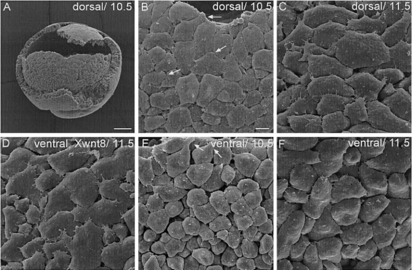 dorsal, stage 11.5. (D) ventral mesendoderm of Xwnt8 mRNA-injected embryo, stage 11.5. (E) ventral stage 10.5. (F) ventral, stage 11.5.