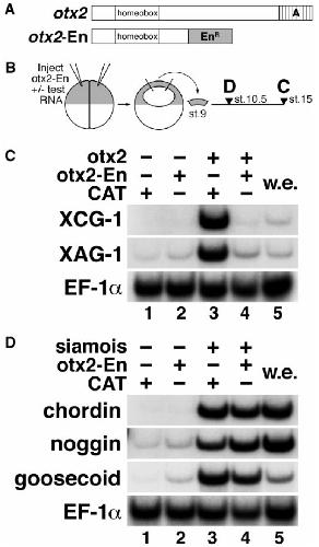 gastrula (stage 10.5; siamois, D) or midneurula (stage 15; otx2, C).