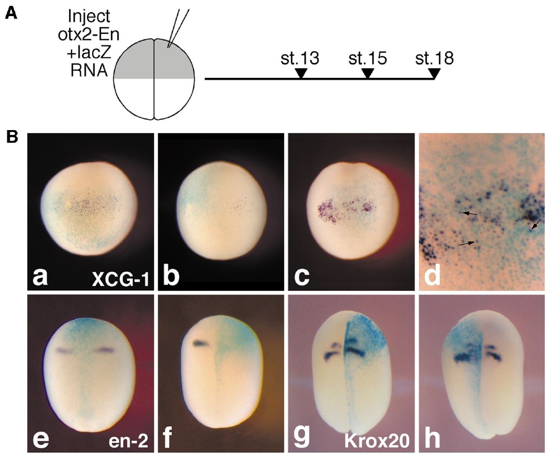 two-cell stage with 100 pg otx2-En or globin control RNA plus 60 pg lacZ RNA. Embryos were allowed to develop until early neurula (stage