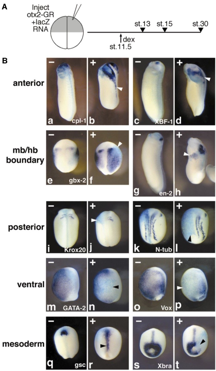 FIG. 1. otx2 activates anterior and represses posterior and ventral gene expression in whole embryos. (A) Albino embryos were injected in one cell at the two-cell stage with 100 pg otx2-GR RNA mixed with 60 pg lacZ RNA. Injected embryos were incubated without or with dexamethasone (dex) beginning at midgastrula (stage 11.5) and until early neurula (stage 13), midneurula (stage 15), or hatching (stage 30). (B) Gene expression in embryos injected with otx2-GR and incubated without (#1113230; or with (#1113090; dex was assayed by whole-mount in situ hybridization. Embryos are oriented with anterior at the top. Dorsal to the right: ad, g, h, m. Dorsal view: e, f, i, q. Arrowheads point to altered patterns of gene expression. otx2 activity at gastrula stages induced ectopic NCAM expression ventrally (Gammill and Sive, 2000) and expanded NCAM expression dorsally, often to the extent that the eye was no longer apparent on the injected side (data not shown). General neural markers N-tubulin (Richter et al., 1988) and nrp-1 (Knecht et al., 1995) behaved similarly (data not shown). Anterior neural: (a) lipocalin, st. 30, -dex; (b) lipocalin, st. 30, +dex; (c) XBF-1, st. 32, -dex; (d) XBF-1, st. 32, +dex. Mid/hindbrain boundary: (e) gbx-2, st. 13, -dex; (f) gbx-2, st. 13, +dex; (g) engrailed-2, st. 32, -dex; (h) engrailed-2, st. 32, +dex. Posterior neural: (i), Krox20, st. 16, -dex; (j) Krox20, st. 16, +dex; (k) N-tubulin, st. 15, -dex; (l) N-tubulin, st. 15, +dex. Ventral ectoderm: (m) GATA-2, st. 13, -dex; (n) GATA-2, st. 13, +dex; (o) Vox, st. 13, -dex; (p) Vox, st. 13, +dex. Mesoderm: (q) goosecoid, st. 13, -dex; (r) goosecoid, st. 13, +dex; (s) brachyury, st. 13, -dex; (t) brachyury, st. 13, +dex. |
