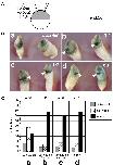 FIG. 5. otx2-En interferes with cement gland formation. (A) Embryos were injected at the two-cell stage with otx2-En RNA without or with otx2 RNA, targeting the future anterior/ventral ectoderm by injecting superficially in the animal pole. lacZ RNA was included as a lineage tracer. Embryos were allowed to develop until hatching (stage 30). (B) Embryos were injected with 100 pg otx2-En (a), 100 pg otx2-En plus 100 pg otx2 (b), 100 pg otx2-En plus 200 pg otx2 (c), or 100 pg globin (d) RNA mixed with 120 pg lacZ RNA. Injected embryos were stained for ï°-galactosidase activity (blue) and scored for cement gland formation by morphology when lineage tracer was present anteriorly (white arrowheads). (C) Embryos from (B) were scored for absent or minimal cement gland formation (defined as no or very few pigmented cells; G absent,gray bars), reduced cement gland formation (a small, round patch of pigmented cells; G reduc.,hatched bars), or normal cement glands (oblong shape, scored relative to size of average control cement gland; ormal,black bars). The data represent four separate rescue experiments. Rescued cement glands often included some ectopic cement gland formation due to the presence of otx2 RNA. |