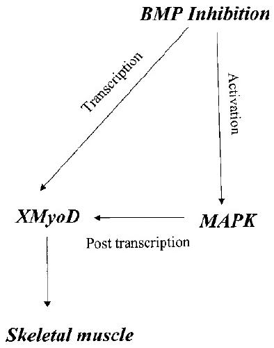 In amphibian development, muscle is specified in the dorsal lateralmarginal zone (DLMZ) of the gastrulaembryo. Two critical events specify the formation of skeletal muscle: the expression of the myogenic transcription factor, XMyoD, and the secretion of bone morphogenetic protein (BMP) antagonists by the adjacent Spemann organizer. Inhibition of BMP signaling during early gastrula stages converts XMyoD protein into an instructive differentiation factor in the DLMZ. Yet, the intracellular signaling factors connecting BMP antagonism and activation of XMyoD remain unknown. Our data show that BMP antagonism induces the activity of mitogen-activated protein kinase (MAPK), and that the activity of MAPK is necessary for muscle-specific differentiation. Treatment of gastrula-stage DLMZ explants with MAPK pathway inhibitors ventralized mesoderm and prevented muscle differentiation. Expression of XMyoD in ventral mesoderm weakly induced muscle formation; however, the coexpression of a constitutively active MEK1 with XMyoD efficiently induced muscle differentiation. Activation of the MAPK pathway did not induce the transcription of XMyoD, but increased its protein levels and transcriptional activity. Thus, MAPK activation is subsequent to BMP antagonism, and participates in the dorsalization of mesoderm by converting the XMyoD protein into a potent differentiation factor.