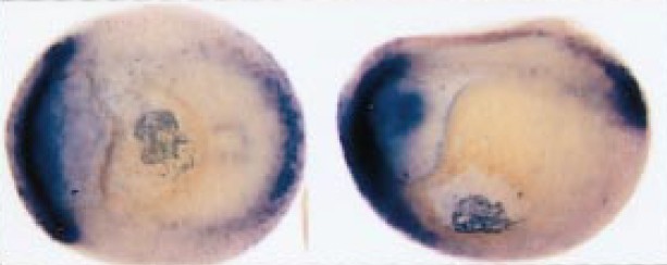 nudt22 (nudix hydrolase 22) gene expression in Xenopus laevis embryos, NF stage 13, as assayed by in situ hybridization. Left image: dorsal view, anterior left. Right image: lateral view of bisected embryo: anterior left, dorsal up. |