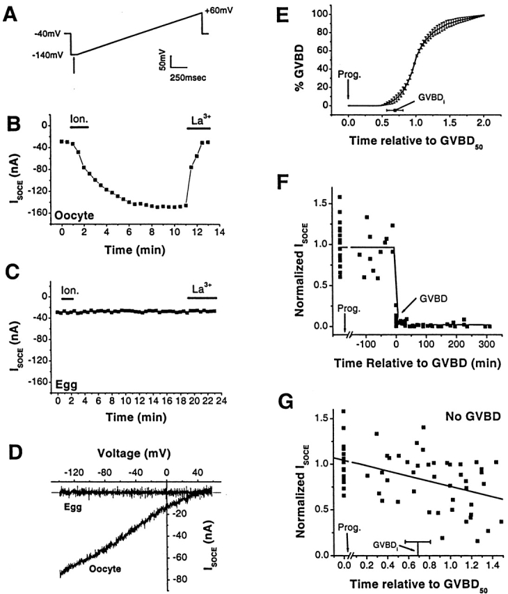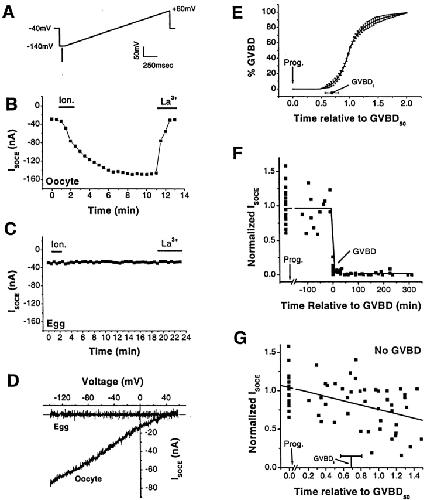 Figure 1. ISOCE during Xenopus oocyte maturation. (A) Voltage protocol used to measure ISOCE development and IâV relationship. The membrane potential was stepped to â140 mV (100 ms), and then ramped from â140 to +60 mV (2 s) from a â40 mV holding potential. The protocol was applied once every 30 s. (B and C) ISOCE development after Ca2+ store depletion with ionomycin (10 μM) in an oocyte (B) and an egg (C). Cells were injected with 7 nmol BAPTA to allow for ISOCE recording (Machaca and Haun, 2000). The current at â140 mV (A, arrow) was plotted over time. La3+ (100 μM) was added at the end of the experiment to block SOCE and obtain a measure of absolute ISOCE. (D) Representative IâV relationships obtained from the ramp voltage stimulation shown in A from an oocyte and an egg. IâV relationships were obtained by subtracting the current after La3+ addition from the current before addition. (E) Time course of progesterone-mediated GVBD. Progesterone was added to a population of at least 50 oocytes, and the occurrence of GVBD over time was recorded by following white spot appearance on the animal pole. The data shown represent the average ± SE from seven donor females. The time of GVBDi ± SD is also shown. GVBDi represents the time at which GVBD was first observed in the population. (F and G) ISOCE levels from individual oocytes at different times during oocyte maturation. Each square represents the current from a single cell. ISOCE data from oocytes are shown before progesterone addition. The data was normalized to average current in oocytes. ISOCE data from 80 cells at different times during maturation are shown in F. (G) ISOCE levels from cells incubated in progesterone without undergoing GVBD (n = 63). The average time ± SD of GVBDi is shown for reference. |