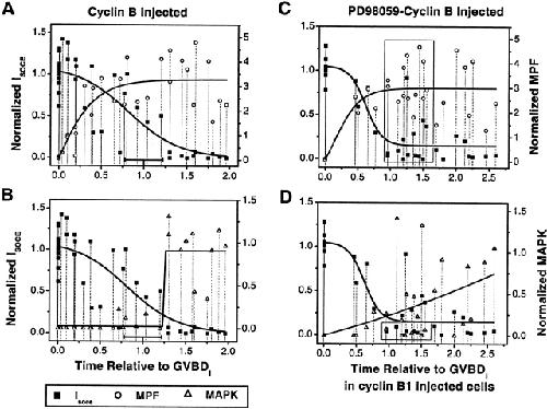 Figure 3. Correlation between ISOCE and MPF and P-MAPK levels after Δ87cyclin B1 protein injection. Oocytes were either directly injected with Δ87cyclin B1 protein (A and B) or preincubated in the MEK inhibitor PD98059 (50–100 μM) for 0.5–2 h before Δ87cyclin B1 injection. ISOCE levels were recorded at various times after Δ87cyclin B1 injection. After ISOCE recording, individual cells were lysed and assayed for MPF and P-MAPK levels. This allowed us to obtain ISOCE (squares), MPF (circles), and P-MAPK (triangles) levels from the same oocyte. The data for individual cells are connected by drop lines to help in matching ISOCE and kinase activity from the same cell. For Δ87cyclin B1 and PD98059-Δ87cyclin B1 injections, current and kinase data from 40 and 33 cells, respectively, are shown. ISOCE levels were normalized to the levels in untreated oocytes, and MPF and MAPK levels were normalized to the levels found in fully mature eggs, as described in Fig. 2. The time scale was normalized to the time at which GVBD initially appeared in the population (GVBDi) after Δ87cyclin B1 injection. The standard deviation of GVBDi is shown in A and B (n = 7). PD98059-treated cells are plotted on a time scale normalized to GVBDi in Δ87cyclin B1–injected cells (A and B). Individual cell data were fitted with a Boltzman function to obtain a general trend of ISOCE inactivation and the activation of the different kinases. |