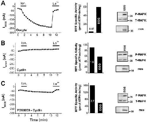 Figure 4. Representative individual cell data from Δ87cyclin B1–injected cells. MPF, P-MAPK, and Mos Western data are shown in conjunction with the levels of each kinase in fully mature eggs (EGG). (A) ISOCE was activated in response to store depletion with ionomycin (10 μM) in an oocyte, and MPF, P-MAPK, and Mos were not detected. (B) A representative oocyte injected with Δ87cyclin B1. ISOCE was not activated in response to store depletion. MPF and P-MAPK levels were 1.6 and 0.9 times those in eggs, whereas Mos kinase was not detected in this oocyte. (C) A representative oocyte preincubated with PD98059 (100 μM) before Δ87cyclin B1 injection. ISOCE was not activated in response to store depletion, MPF levels were 2.7 times higher than those found in the control egg lysate, and both P-MAPK and Mos were not detectable. |
