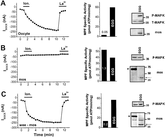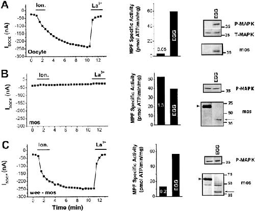 Figure 6. Representative individual cell data from Wee1- and Mos-injected cells. MPF, P-MAPK, and Mos Western data are shown in conjunction with the levels of each kinase from a lysate of fully mature eggs (EGG). (A) ISOCE was activated in response to store depletion with ionomycin (10 μM) in an oocyte. MPF, P-MAPK, and Mos were not detected in this cell. (B) A representative cell injected with 10 ng GST–Mos RNA. ISOCE was not activated in response to store depletion. ISOCE was recorded at the 1GVBDi time point in this cell, i.e., at about the same time that GVBD first occurred in the population. MPF and P-MAPK levels were 1.3 and 1.6 times, respectively, higher than those in the egg lysate. GST–Mos protein (arrowhead) levels were 13.1 times higher than egg levels and no endogenous Mos protein (arrow) was detected. (C) A representative cell preinjected with 10 ng GST–107Wee1 RNA 14 h before GST–Mos RNA (10 ng) injection. We recorded ISOCE at the 1GVBDi time point. SOCE was readily activated, in response to store depletion, to levels similar to those found in oocytes. Injection of GST–107Wee1 effectively blocked MPF activation, which was detected at 0.2 times egg level. In contrast, P-MAPK and GST–Mos (arrowhead) were detected at 0.76 and 8.7 times egg levels, respectively. |
