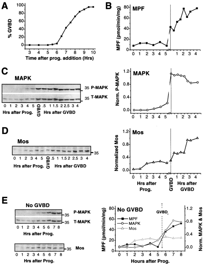 Figure 2. Time course of MPF, MAPK, and Mos activation during progesterone-induced maturation. (A) Time course of GVBD. GVBDi occurred at 5.5 h, and GVBD50 ∼7.25 h after progesterone addition. At each time point, five cells were pooled to quantify kinase activity. (B–D) MPF, P-MAPK, and Mos levels during oocyte maturation. MPF activity was measured as the histone H1 kinase activity as described in Materials and methods. The levels of P-MAPK and Mos were determined by Western blot analysis using a P-MAPK–specific and anti-Mos antibody, respectively, as described in Materials and methods. In the case of MAPK, the same blot was reprobed with an antibody that detects total MAPK (T-MAPK) levels, showing that MAPK was present in the lysates but was not phosphorylated. To be able to compare P-MAPK and Mos levels between different experiments, we always ran a positive control lysate from eggs on every gel, and normalized P-MAPK and Mos levels to that sample. Therefore, Western data for P-MAPK and Mos throughout this manuscript are normalized to the same egg lysate (see Materials and methods for more details). The time scale is divided into two phases: after progesterone addition; and after GVBD. The 35-kD molecular mass marker is shown on the right of the gels. (E) MPF, P-MAPK, and Mos levels in cells treated with progesterone, but that did not undergo GVBD. GVBDi is indicated for reference. This time course of kinase activation is representative of five similar experiments. |