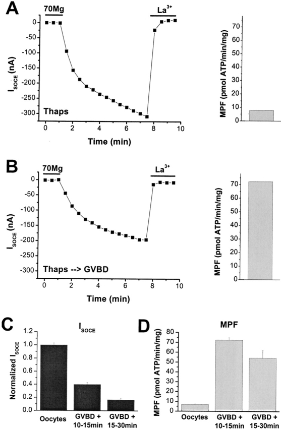 Figure 8. Pre-activated ISOCE does not inactivate in response to MPF activation. Oocytes were incubated in Ca2+-free medium (L-15 with Ca2+, buffered at 50 μM), containing thapsigargin (1 μM) to deplete intracellular Ca2+ store and activate ISOCE. Cells were voltage clamped in a Ca2+-free solution (70Mg; see Materials and methods) and then switched to a solution containing 30 mM Ca2+ (30Ca; see Materials and methods) to induce Ca2+ influx through SOCE channels. (A) ISOCE and MPF levels from a control thapsigargin–treated oocyte. (B) Oocytes were treated with progesterone (5 μg/ml) for 1 h and then thapsigargin (1 μM) was added, and the cells were incubated until GVBD occurred. ISOCE was measured ∼15 min after GVBD occurrence. ISOCE was still present in this cell, although MPF was activated at high levels, indicating that MPF is unable to block SOCE that has been preactivated before MPF induction. ISOCE (C) and MPF (D) levels in oocytes (n = 5) and cells treated with progesterone 10–15 min (n = 8) and 15–30 min after GVBD (n = 7). ISOCE levels gradually declined after GVBD and MPF levels remained relatively stable. |