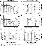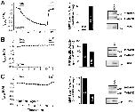 Figure 5. Correlation between ISOCE and Mos, P-MAPK, and MPF levels after injection of GST–Mos RNA. GST–Mos is a fusion protein between GST and Xenopus Mos, which allowed the separation between endogenous Mos (39 kD) and recombinant, injected GST–Mos (64 kD) (see Materials and methods). Oocytes were either directly injected with 10 ng GST–Mos RNA (A–C) or preinjected with 10 ng of GST–107Wee1 (Wee) 13–16 h before Mos RNA injection. GST–107Wee1 is a constitutively active form of the Wee1 kinase, which blocks MPF activation (Howard et al., 1999). ISOCE levels recorded at various times after GST–Mos RNA injection. After ISOCE recording, individual cells were lysed and assayed for kinase activities. This allowed us to obtain ISOCE (squares), Mos (diamonds), P-MAPK (triangles), and MPF (circles) levels from the same oocyte. For Mos and Wee1–Mos injections, current and kinase data from 40 and 27 cells, respectively, are shown. The plotted Mos data is for GST–Mos protein levels, as endogenous Mos was not detected in these experiments. The data for individual cells are connected by drop lines to help in matching ISOCE and kinase activity from the same cell. ISOCE levels were normalized to the levels in untreated oocytes, and Mos, MAPK, and MPF levels were normalized to the levels found in fully mature eggs as described in Fig. 2 and Materials and methods. The time scale was normalized to GVBDi, the standard deviation of which is shown in A–C (n = 5). Cells preinjected with GST–107Wee1 were plotted on the same time scale as GST–Mos-injected cells (D–F). Individual cell data were fitted with a Boltzman function to obtain a general trend of ISOCE inactivation and the activation of the different kinases. |