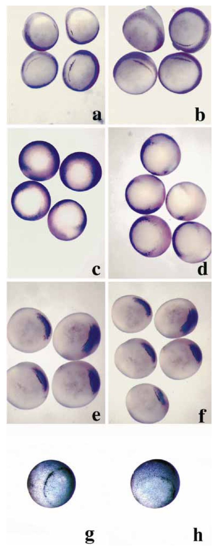 11 embryos that were injected with b-gal mRNA (a, c, e, g) or coinjected