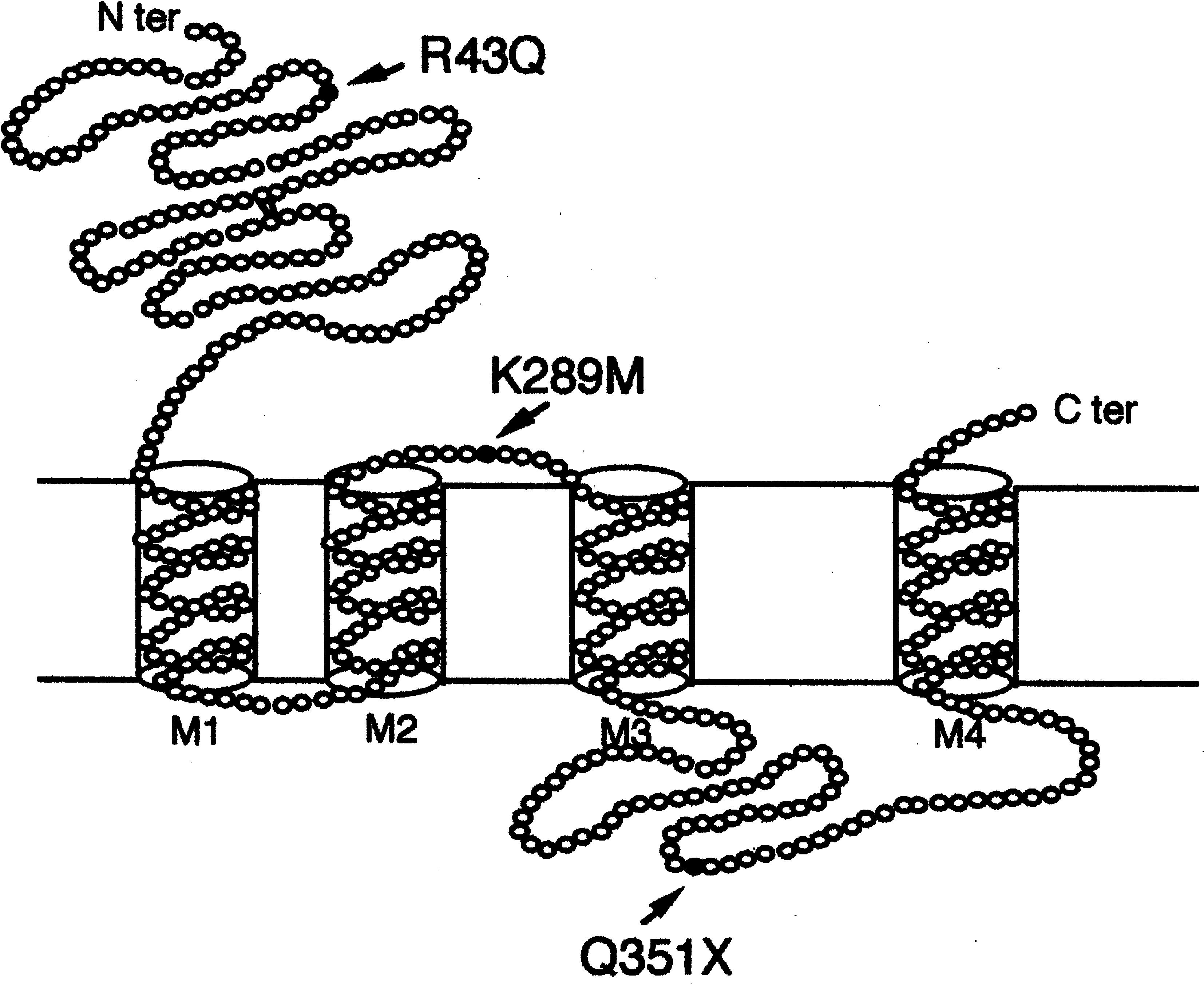Figure 3. Schematic representation of the GABRG2 protein, with arrows indicating the positions of mutations associated with epilepsy.