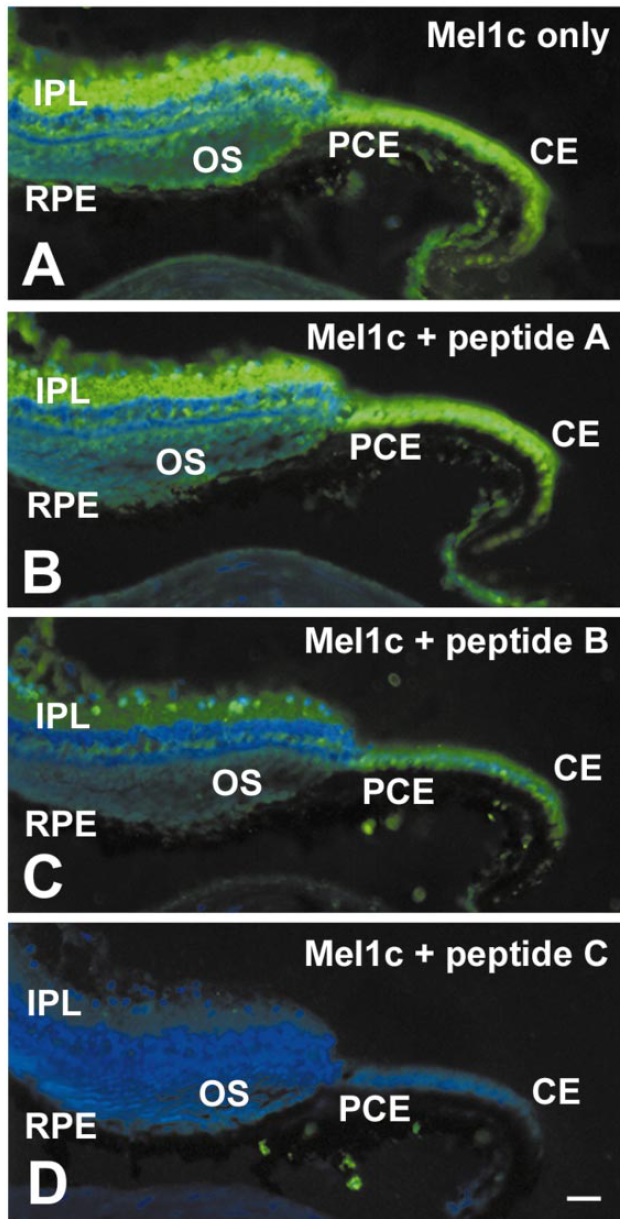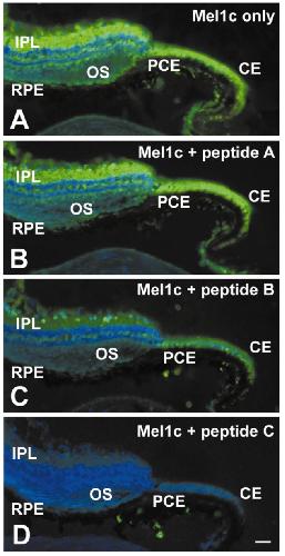 Xenopus eye were incubated with the Mel1c receptor antibody only or with antibody plus excess Mel1c peptide (control). The