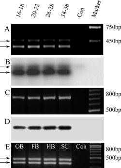 adult brain regions (E) assayed by RT-PCR. RT-PCR products in