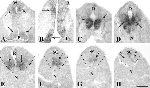 hybridization signals (arrows in B) were present mainly in the Rohon-