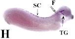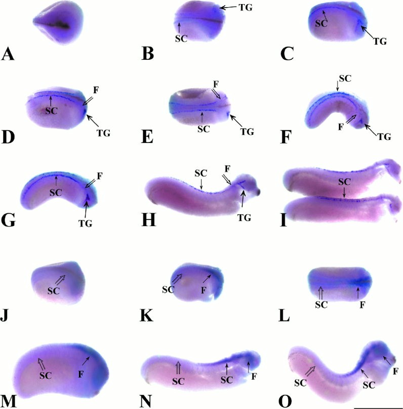 arrows in KâO). SC, spinal cord; F, forebrain; TG, trigeminal ganglion.