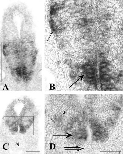 floor plate (open arrow in D) or alar region. N, notochord. Scale bar 5