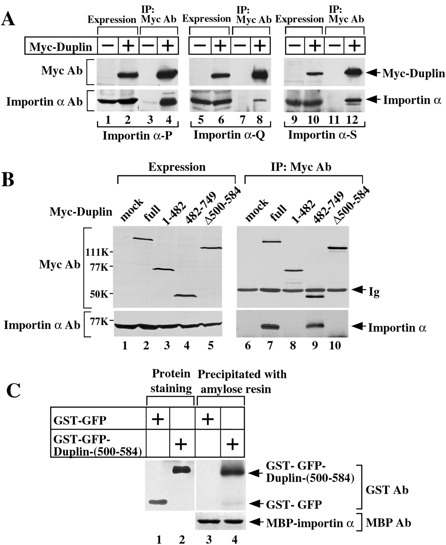 Ab, antibody. B, interaction of Duplin mutants with importin