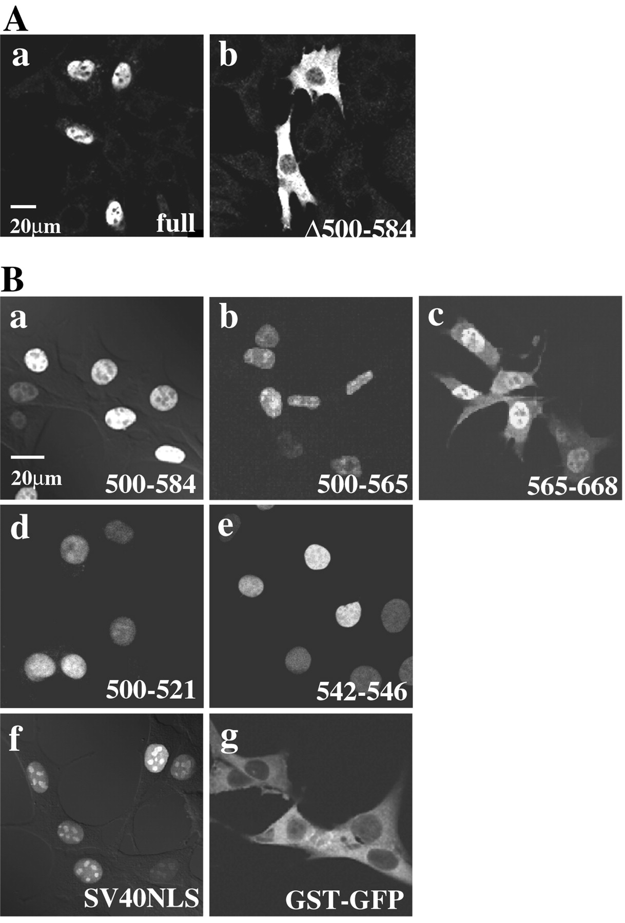 (542–546)-GFP (e), GST-SV40NLS-GFP (f), and GST-GFP (g) were