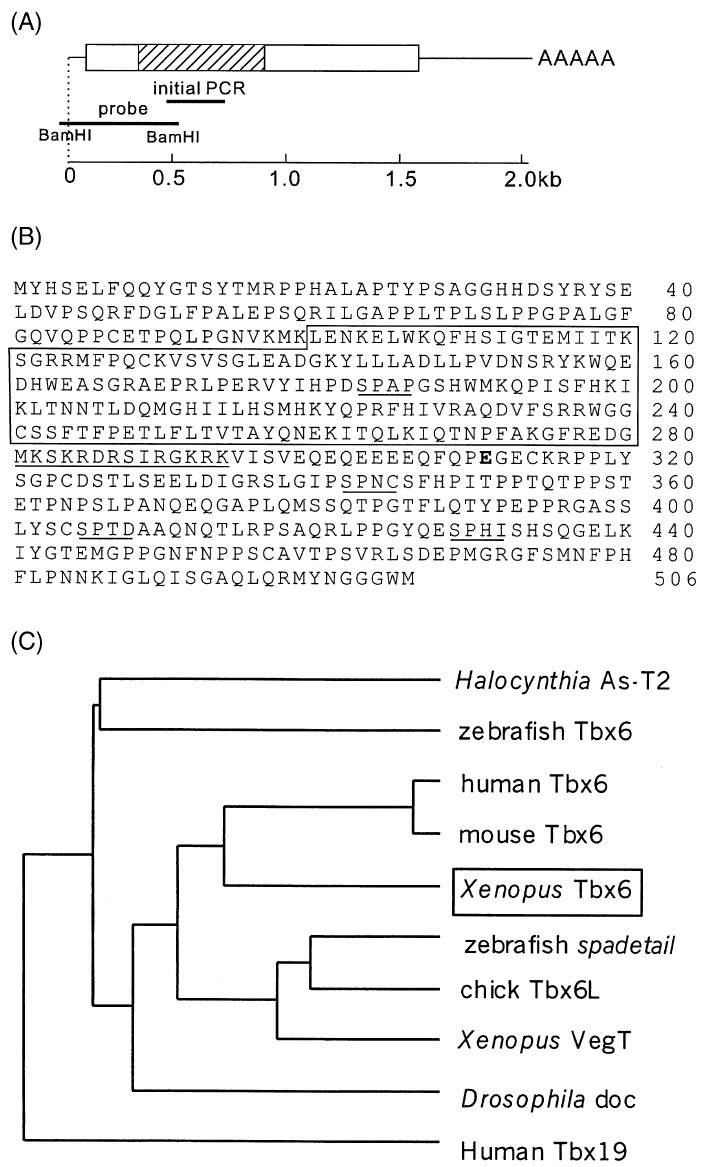 Fig. 1. (A) Structure of Tbx6 cDNA. The white box is a coding