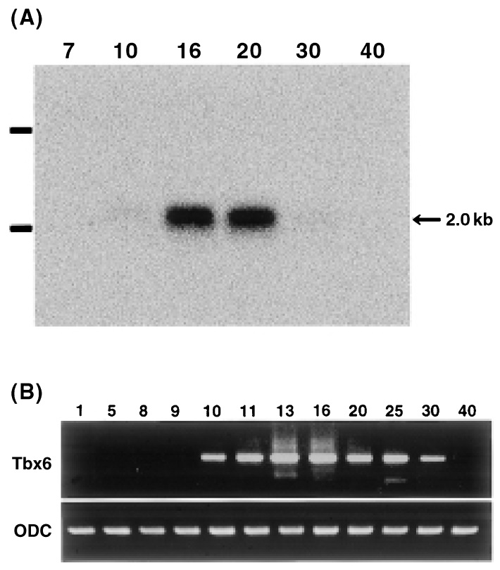 Fig. 2. (A) Northern blot analysis of Tbx6. Two solid lines on the