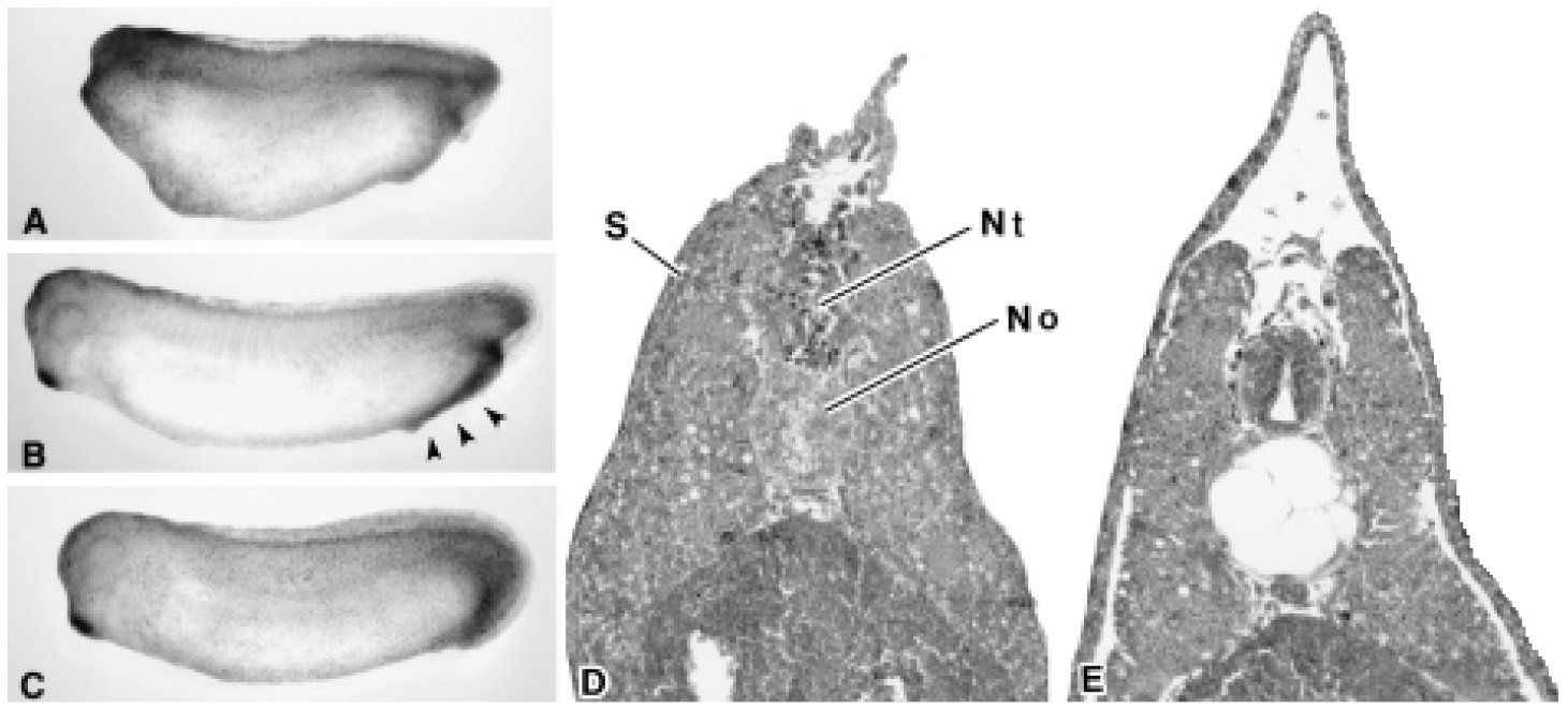 with (F). In contrast, the somite is enlarged. Nt, neural tube; No, notochord; S, somite. (F) Transverse section of a normal stage 31