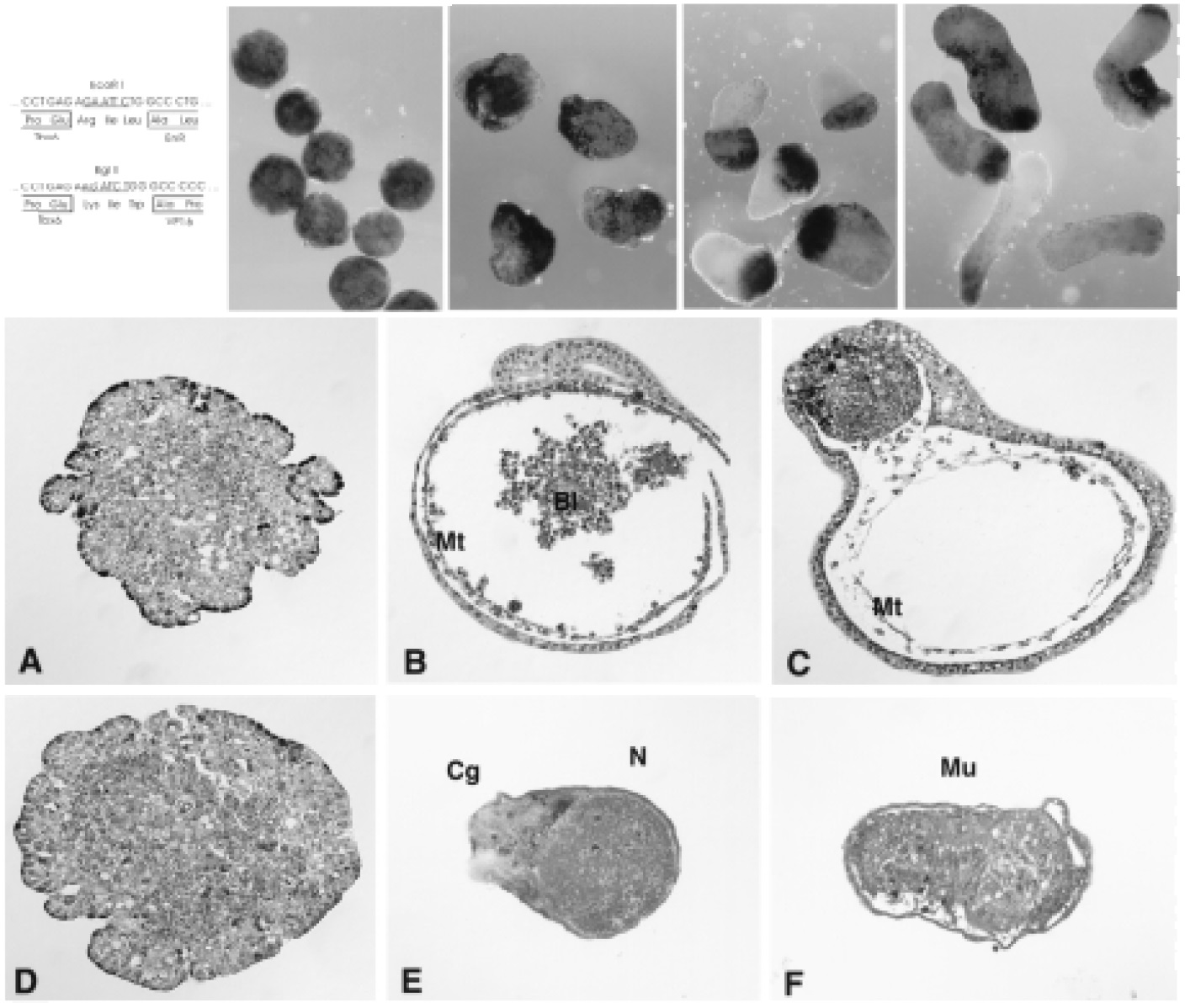 Fig. 5. Appearance and histology of the animal cap explant. (A) The Tbx6 gene was fused to EnR and VP16. (B–E) Animal cap explants