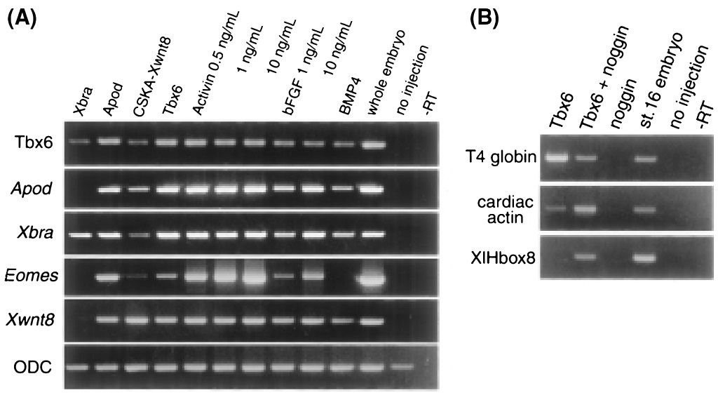 and the Tbx6 band in Tbx6 mRNA-injected animal caps indicate auto-inductions, respectively, because the Xbra R primer, Apod R
