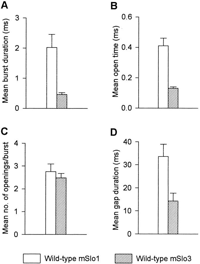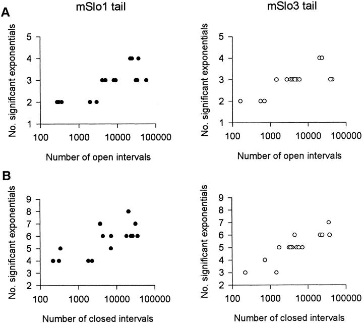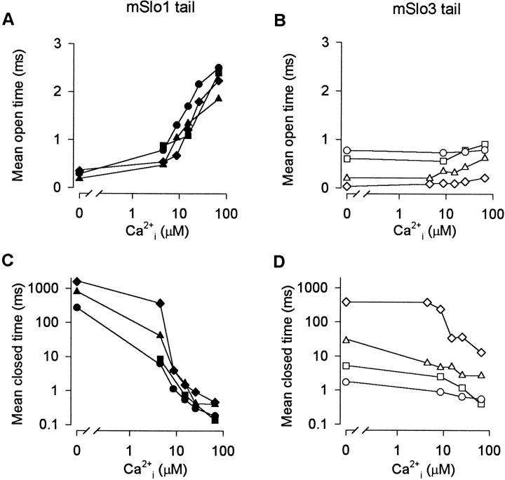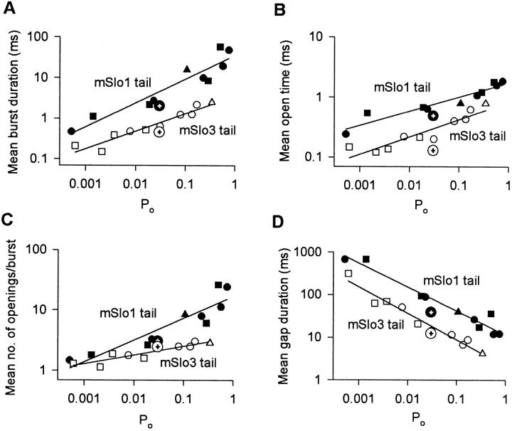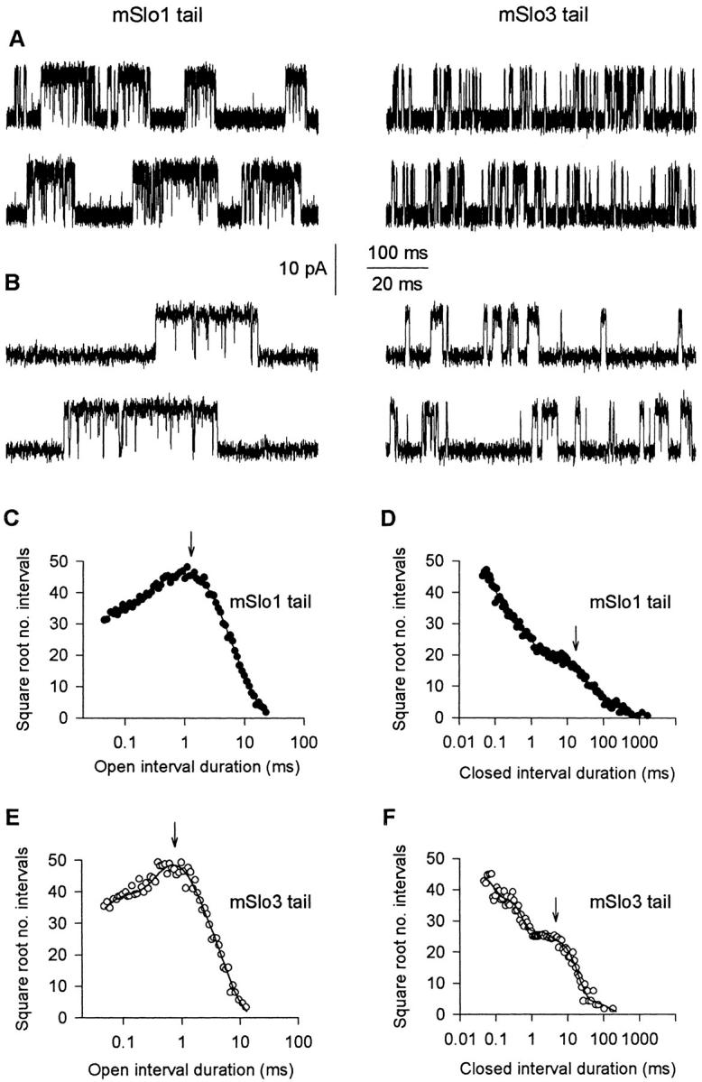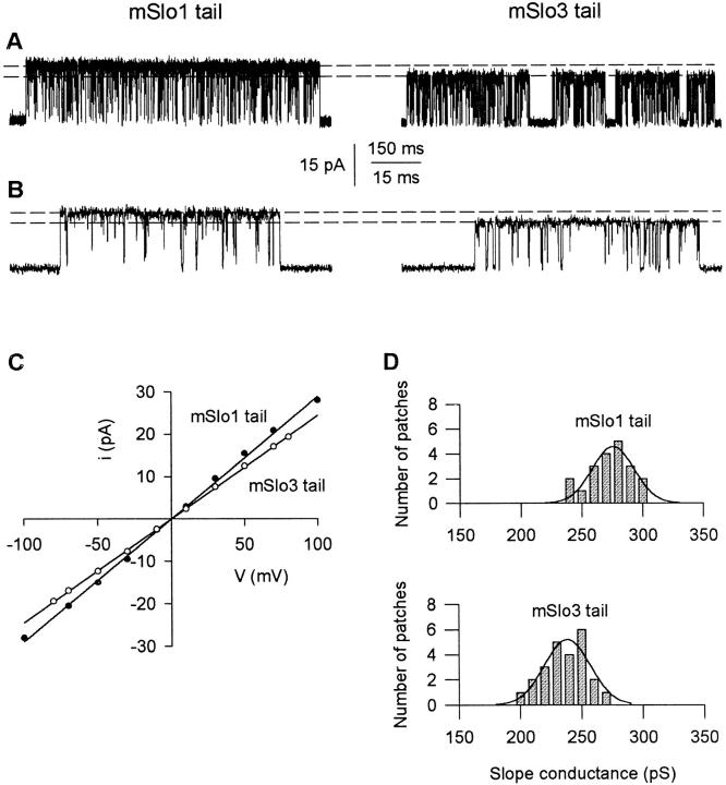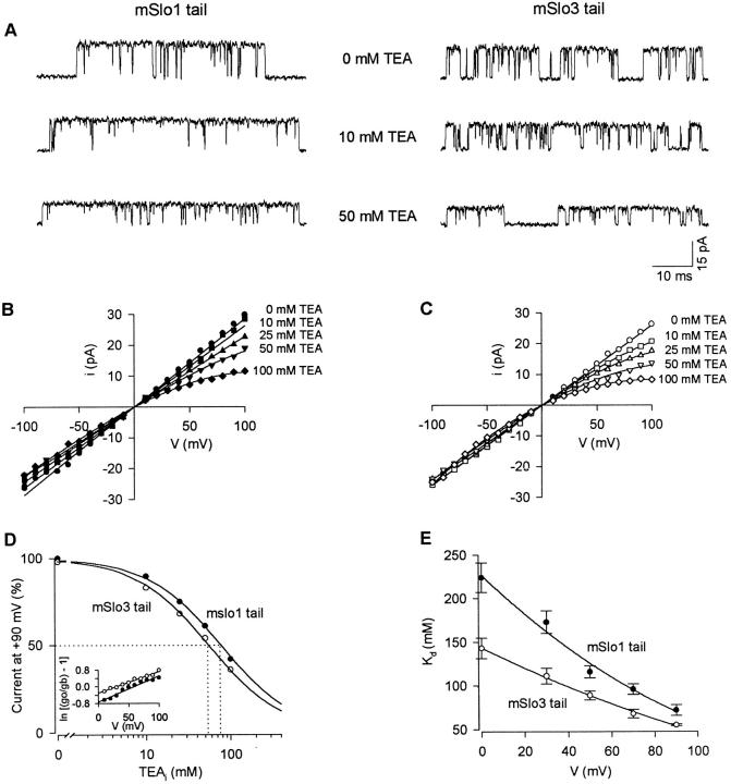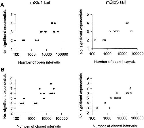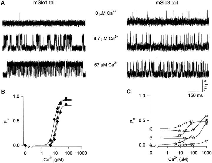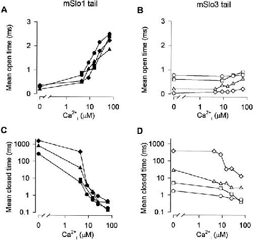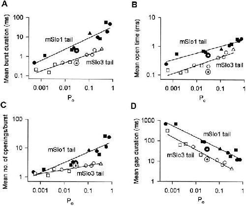 The COOH-terminal S9-S10 tail domain of large conductance Ca(2+)-activated K(+) (BK) channels is a major determinant of Ca(2+) sensitivity (Schreiber, M., A. Wei, A. Yuan, J. Gaut, M. Saito, and L. Salkoff. 1999. Nat. Neurosci. 2:416-421). To investigate whether the tail domain also modulates Ca(2+)-independent properties of BK channels, we explored the functional differences between the BK channel mSlo1 and another member of the Slo family, mSlo3 (Schreiber, M., A. Yuan, and L. Salkoff. 1998. J. Biol. Chem. 273:3509-3516). Compared with mSlo1 channels, mSlo3 channels showed little Ca(2+) sensitivity, and the mean open time, burst duration, gaps between bursts, and single-channel conductance of mSlo3 channels were only 32, 22, 41, and 37% of that for mSlo1 channels, respectively. To examine which channel properties arise from the tail domain, we coexpressed the core of mSlo1 with either the tail domain of mSlo1 or the tail domain of mSlo3 channels, and studied the single-channel currents. Replacing the mSlo1 tail with the mSlo3 tail resulted in the following: increased open probability in the absence of Ca(2+); reduced the Ca(2+) sensitivity greatly by allowing only partial activation by Ca(2+) and by reducing the Hill coefficient for Ca(2+) activation; decreased the voltage dependence approximately 28%; decreased the mean open time two- to threefold; decreased the mean burst duration three- to ninefold; decreased the single-channel conductance approximately 14%; decreased the K(d) for block by TEA(i) approximately 30%; did not change the minimal numbers of three to four open and five to seven closed states entered during gating; and did not change the major features of the dependency between adjacent interval durations. These observations support a modular construction of the BK channel in which the tail domain modulates the gating kinetics and conductance properties of the voltage-dependent core domain, in addition to determining most of the high affinity Ca(2+) sensitivity.
