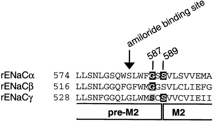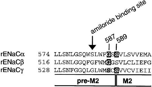 Figure 1. Sequence alignment of the preM2/M2 segments of rat α, β, and γ ENaC. The number of the first residue shown is indicated. The putative start of M2 and the position of the amiloride binding site (αS583, βG525, and γG537) are indicated. Mutations that change ionic selectivity are mutations of αG587 and αS589 as well as residues at the homologous positions in β and γ subunits. Residues shown in white on a dark background change Na+/K+ selectivity when mutated, and mutation of αG587 and the homologous residues in β and γ subunits change Li+/Na+ selectivity. Mutation of γS541 (shown in black on gray background) changes Li+/Na+, but not Na+/K+ selectivity. |
