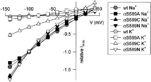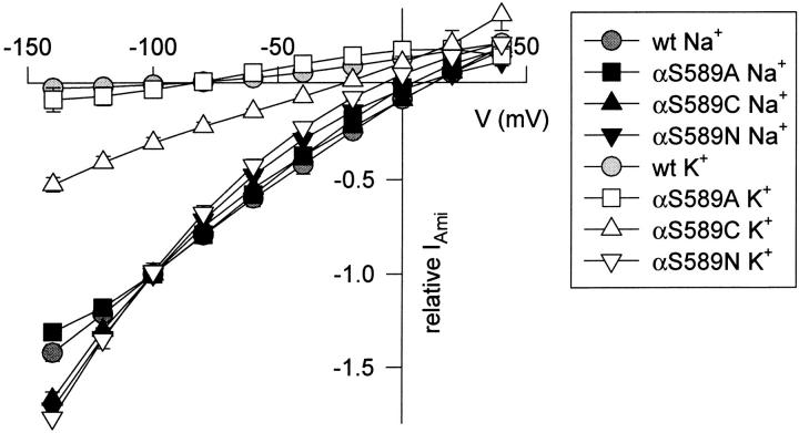 Figure 2. The K+/Na+ permeability ratio is increased by αS589 mutations. Current-voltage relationship in 120-mM Na+ and 120-mM K+ bath solution from oocytes expressing αS589A, αS589C, and αS589N measured with two-electrode voltage clamp. Currents were measured during 1-s voltage steps from a holding potential of −20 mV to test potentials of −140 to +40 mV in 20-mV increments. Currents measured in the presence of 10 μM amiloride were subtracted from currents measured in the absence of amiloride. In each experiment, the amiloride-sensitive Na+ and K+ currents were normalized to the amiloride-sensitive Na+ current at −100 mV. To allow Na+ to enter the oocyte during the expression phase without downregulation of channel activity, mutant α subunits were coexpressed with β subunits containing the Liddle mutation βY618A together with wt γ ENaC and oocytes were kept in a solution containing 90 mM Na+ during the expression phase (Kellenberger et al. 1998). The mutation βY618A does not affect ion selectivity. Erev, Na − Erev, K was 114 mV (wt), 96 mV (αS589A), 37 mV (αS589C), and 15 mV (αS589N), n = 4–5. INa at −100 mV was 30.0 ± 3.6 μA (αS589A), 8.3 ± 1.7 μA (αS589C), and 9.3 ± 2.1 μA (αS589N). |