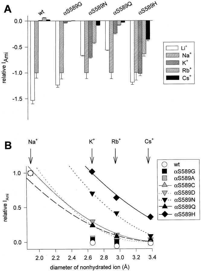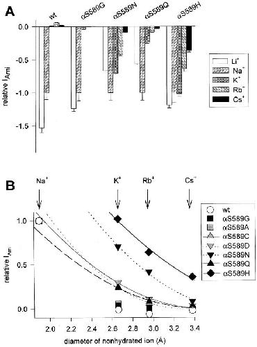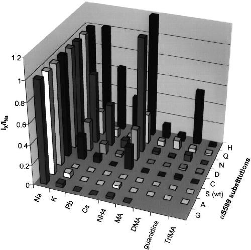 Figure 7. Graphical summary of the main results with inorganic and organic cations. Bar graph summarizing the amiloride-sensitive current ratios IX/INa for all ions in all αS589 mutants tested. On the axis âαS589 substitutions,â the different mutants are labeled by the single-letter code of the substituting amino acid. The ions are represented in the order of their size (diameter derived from Pauling radius for alkali metal cations and minimum diameter [Sun et al. 1997] for organic cations). The minimum diameter is as follows (in Ã