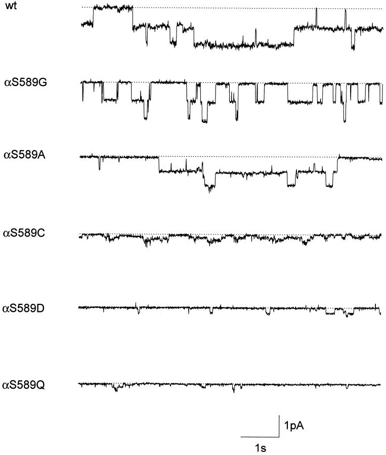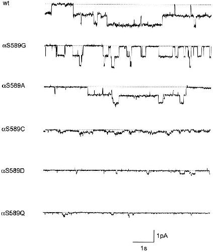 Figure 5. Single-channel records of ENaC wt and αS589 mutants. Traces are from outside-out patches from Xenopus oocytes at a holding potential of −100 mV in extracellular Li+ solution. The dotted lines indicate the baseline when all ENaC channels in the patch are closed. The outside-out configuration was chosen to verify amiloride-sensitivity of channel activity. |