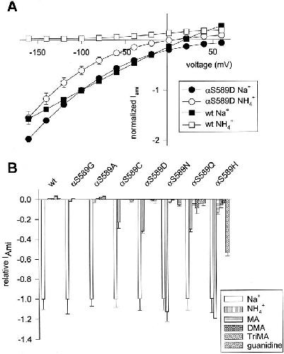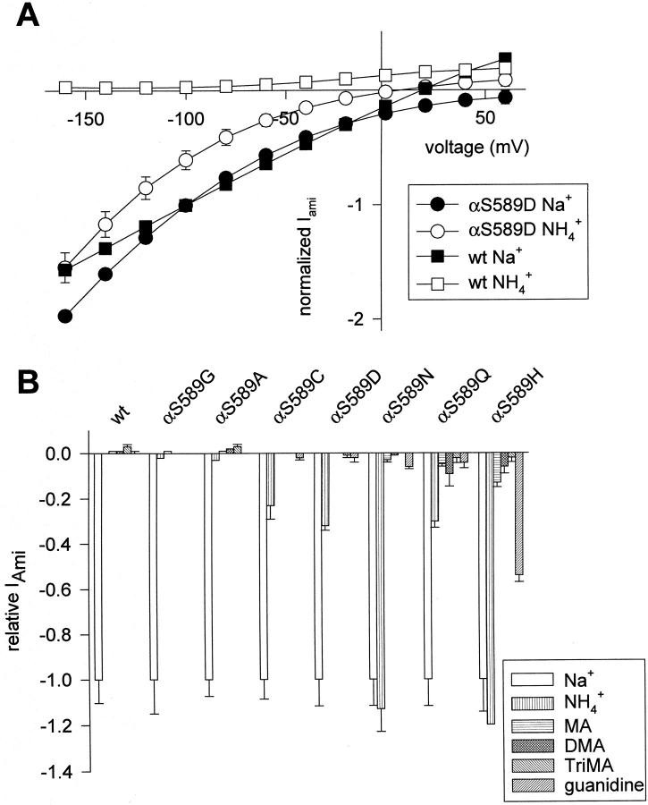 Figure 6. Selectivity of αS589 mutants to organic cations. (A) I-V relationship of amiloride-sensitive Na+ and NH4+ currents in Xenopus oocytes expressing either ENaC wt or the αS589D mutant. Currents were measured during 500- ms voltage-steps from a holding potential of â100 mV to test potentials of â160 to +60 mV in 20-mV increments. Currents measured in the presence of 5 μM amiloride were subtracted from currents measured in the absence of amiloride. Amiloride-sensitive currents were in each oocyte normalized to the amiloride-sensitive Na+ current at â100 mV. (B) Macroscopic amiloride-sensitive currents were measured at â100 mV in oocytes superfused with Na+, NH4+, MA, DMA, TriMA, or guanidine external solution (materials and methods). Amiloride-sensitive currents are normalized to INa, and presented as mean ± SEM (n = 2â20 per condition). Positive current values correspond to outward currents. |