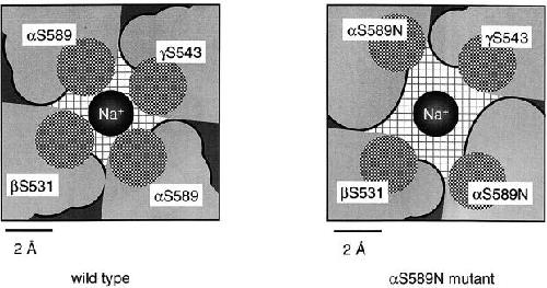 Figure 8. Model illustrating the mechanism by which mutations of αS589 may enlarge the channel pore at the selectivity filter. Residue αS589 and analogues in the β and γ subunit arranged around the channel pore are shown in a cross-section of the pore seen from the top for wt ENaC (left) and the mutant αS589N (right). Each residue is represented by its backbone part in gray, with the carbonyl oxygen shown as a hatched circle pointing toward the pore lumen and the side chain identified by the black edge. The side chains are located at the interface between the subunits. Increasing the size of the side chain of the two αS589 residues adds extra volume at the subunit–subunit interface and makes the pore wider. |