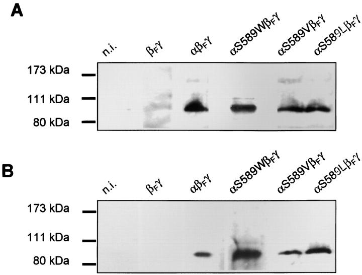 Figure 3. Analysis of translation of wt and mutant α subunits and of assembly with β subunits. Oocytes were not injected or injected with RNAs encoding ENaC carrying a FLAG epitope on the β subunit, αβFγ, αS589LβFγ, αS589VβFγ, αS589WβFγ, or βFγ, as indicated. (A) Western blot immunostaining of solubilized wt and mutant ENaC subunits. Solubilized proteins were subjected to SDS-PAGE, and αENaC was visualized on Western blots using an anti–rat αENaC antibody (May et al. 1997). Molecular markers are indicated. (B) Western blot immunostaining for coimmunoprecipitation of wt and mutant ENaC under nondenaturing conditions. Nondenaturing coimmunoprecipitation was performed with an anti-FLAG antibody. Immunoprecipitates were subjected to SDS-PAGE and αENaC was visualized on Western blots using an anti–rat αENaC antibody. Specificity of the anti–rat αENaC antibody is demonstrated by a control in which no αENaC RNA was injected (βFγ). |