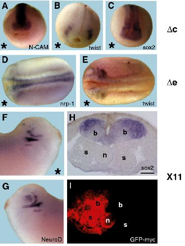 Fig. 9. Expression of Xcadherin-11 constructs neither inhibits neural crest induction nor alters CNS and PNS pattern. (A-C) Stage 15 embryos single-side injected with δcXcad-11 RNA. (D,E) Stage 20 embryos injected with δ eXcad-11 RNA. (F,G) Stage 28 embryo injected with Xcad-11 RNA. (H,I) Transverse sections of stage 28 embryo injected with Xcad-11: (H) in situ hybridisation with sox2 probe; (I) GFP-Myc immunostaining of the same section shown in H. Marker detection as indicated. b, brain; n, notochord; s, somites; asterisk, injected side. Scale bar: 50 μm.