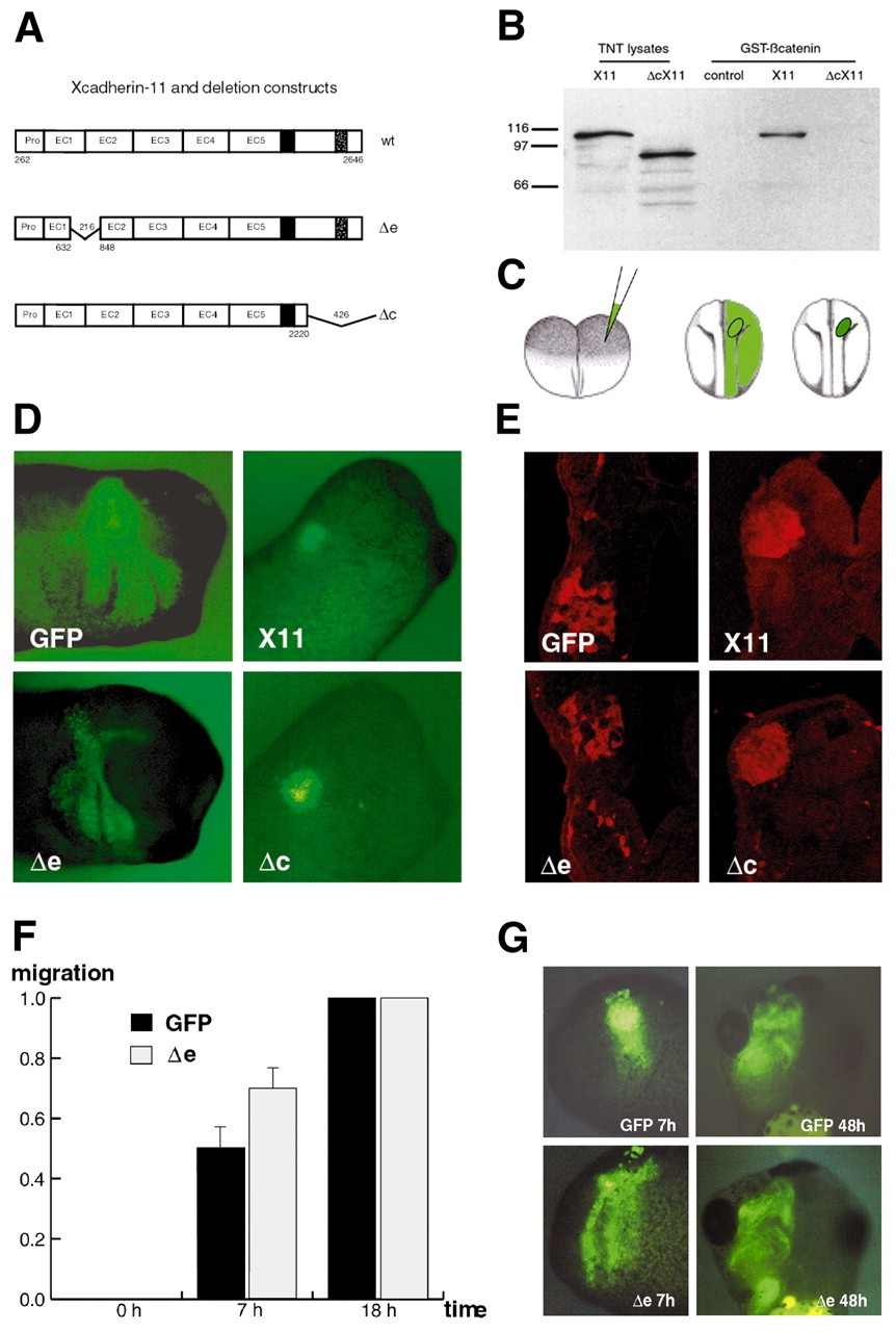 Fig. 1. The extracellular Xcadherin-11 domain regulates adhesion of CNC cells in the transplantation assay, independently of β-catenin-binding. (A) Wild-type and Xcad-11 deletion constructs (black, transmembrane segment; dots, β -catenin-binding site). (B) GST-β-catenin pull-down assay. Western blot showing TNT lysates of full-length (X11pcDNA3.1/Myc-His-A) and cytoplasmic-deleted Xcad-11 (δcX11pcDNA3.1/Myc-His-A), all stained with 9E10 Myc antibody (left). Only the full-length Xcad-11 binds the GST-β-catenin fusion protein (right). (C) Transplantation assay. (D) Comparison of cranial neural fold transplants overexpressing different Xcad-11 constructs. Migratory phenotype analysed by GFP fluorescence 18 hours after transplantation. (E) Confocal analysis of transverse transplant sections stained with 9E10 Myc antibody. (F) Transplants expressing the extracellular deletion mutant, δeXcad-11 (δe), started migration earlier than GFP controls. The graph illustrates the comparison of 49 migrating GFP with 46 migrating δeXcad-11 (δe) grafts 0, 7 and 18 hours after transplantation. (G) Lateral views of a transplant expressing δeXcad-11 7 hours after transplantation, showing farther migration compared with the GFP control (left). Dorsal views of the same grafts show no differences after 48 hours (right).