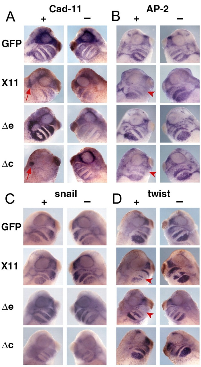 Fig. 2. Migration behaviour controlled by Xcadherin-11 affects specific neural crest markers differently. (A) Xcad-11, (B) AP-2, (C) Snail, and (D) twist whole-mount in situ hybridisation of transplants injected with GFP alone, Xcad-11, extracellular (δe) or cytoplasmic (δc) deletion mutants. The transplant-containing side (+) is compared with the control side (-) of the same embryo. Arrowheads indicate areas of different marker expression, arrows mark the non-migrating graft.