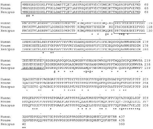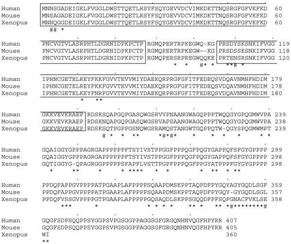 Figure 1. Evolutionary conservation of the DAZAP1 proteins. The amino acid sequences of the human and mouse DAZAP1s and the Xenopus Prrp are compared. The two RNA binding domains are boxed. Differences between the human and the mouse sequences, and between the mouse and Xenopus sequences are marked by #'s and *'s, respectively.