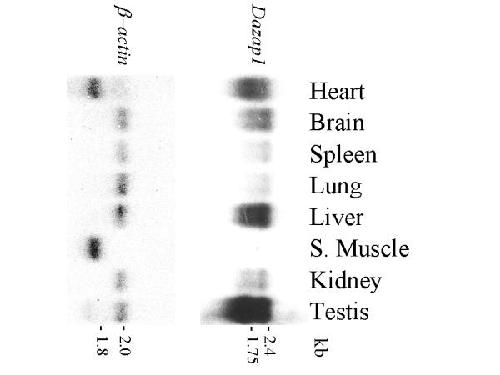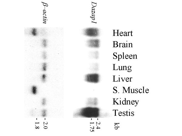 Figure 2. Expression of Dazap1 in adult mouse tissues. A mouse multiple-tissue Northern blot was hybridized with a Dazap1 cDNA probe, stripped, and rehybridized with a β-actin probe. Dazap1 is expressed most abundantly in the testis.