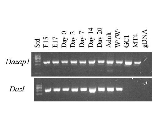 Figure 3. Developmental expression of Dazap1 and Dazl in mouse testes. RT-PCR was performed on total testicular RNAs isolated from day 15 (El 5) and day 17 (El 7) embryos, new born mice (Day 0), and mice at various days after birth. Wv/Wv testes contain diminished germ cell population due to a mutated W (White spotted) gene. GC1 and MT4 are mouse germ cell and Sertoli cell lines, respectively, and gDNA is mouse genomic DNA. The PCR primers span over introns and produce much larger (if any) fragments from genomic DNA.