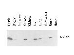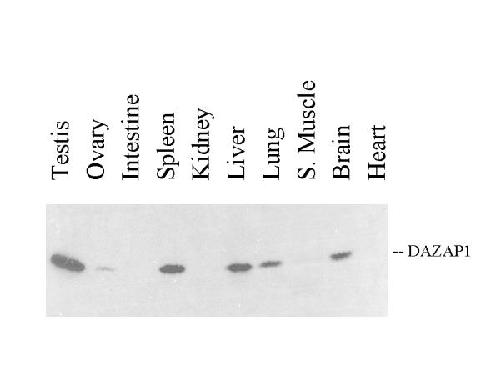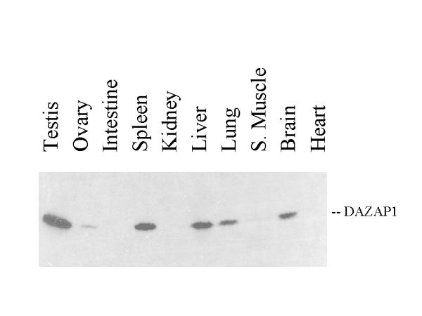 Figure 4. Expression of the DAZAP1 protein in adult mouse tissues. Equal amounts of total protein from various tissue extracts were applied to a 10% SDS-polyacrylamide gel and western blotted with the anti-DAZAP1-P antibody.