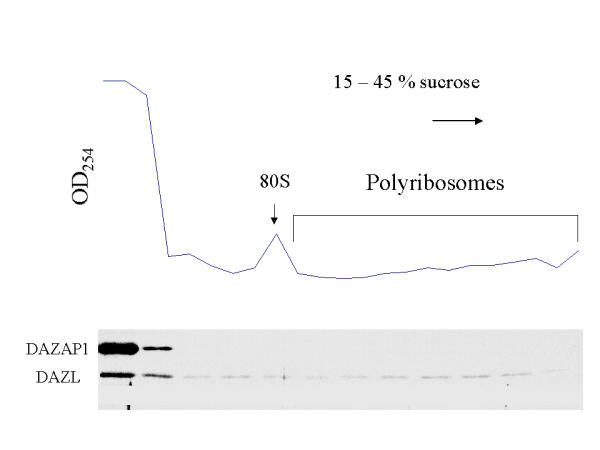 Figure 6. Sucrose gradient analyses shows that DAZAP1 is not associated with polyribosomes. The post-mitochondrial supernatant of mouse testis extracts was analyzed on a 15–45% sucrose gradient. Sedimentation was from left to right. The presence of DAZAP1 and DAZL in each fractions was analyzed by Western blotting.