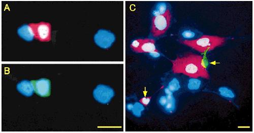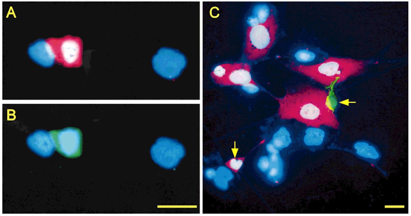 a dextran injected, Stage 24 embryo [red cell in (A)] were dissociated, mixed, plated, and 24 h later