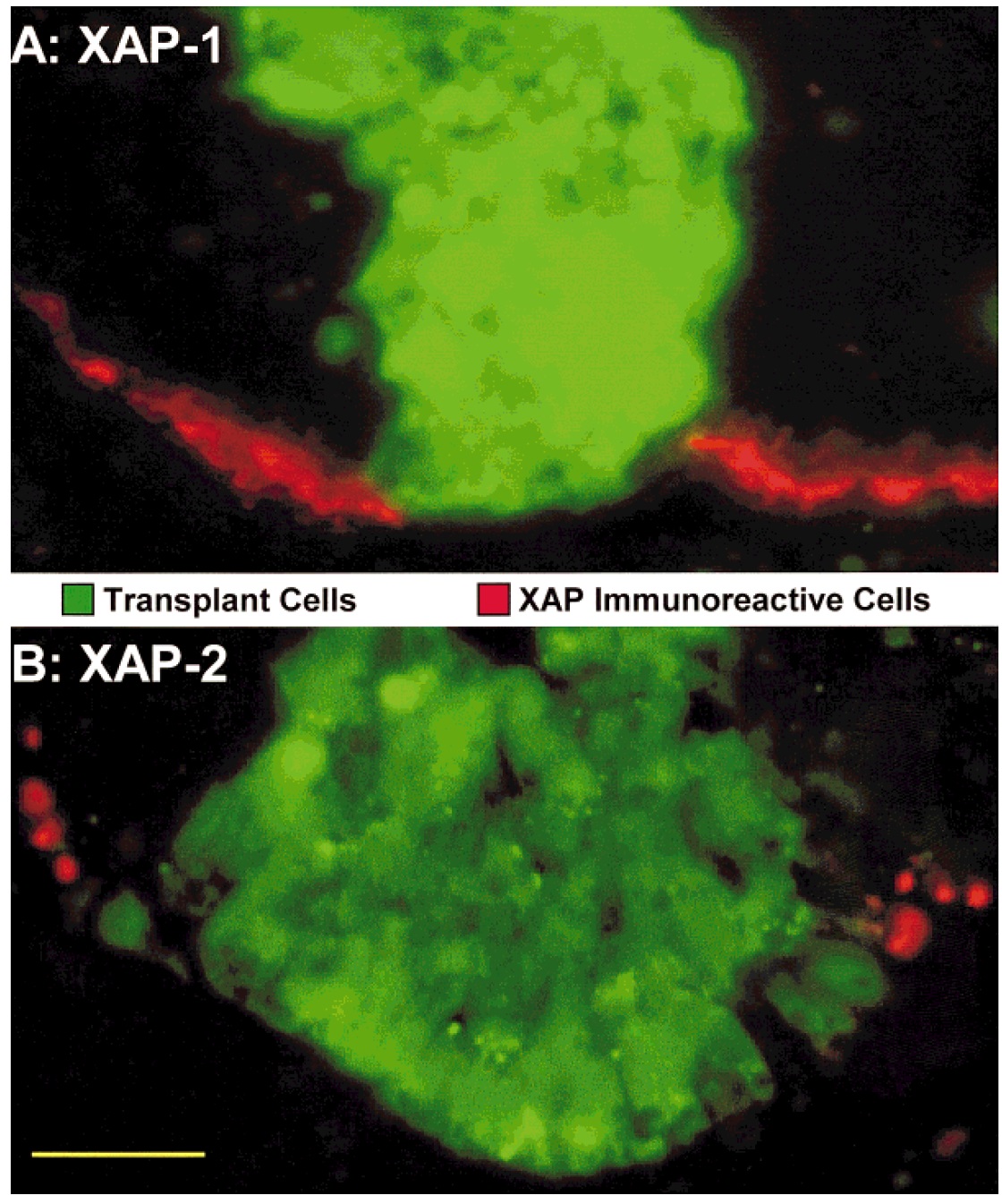 XAP-2 (B). Note that both XAP-1 and -2 immunoreactivity extends to the border of the transplant,